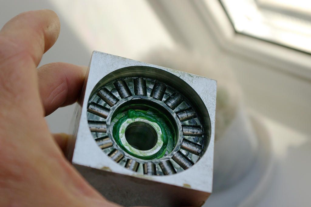 На поверхности упорной пяты подшипника ясно видна кольцевая дорожка от движения роликов, то есть
