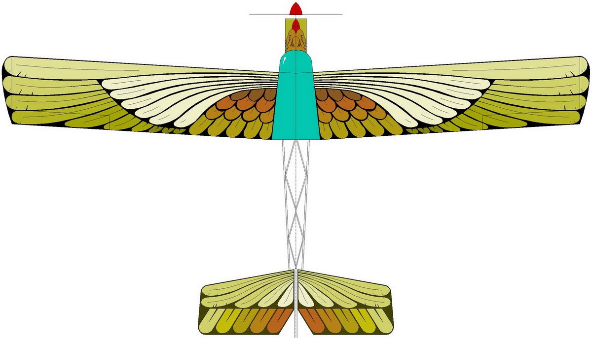 Он так красив полупрозрачным, что не могу не сказать еще раз о пленке. Я про нее когда упоминаю, я думаю лишь о некоторых деталях и элементах на которых ее можно наклеивать. Часть крыльев, оперение. И что хочу предложить- графику, орнамент, нарезать из витражной пленки!!! Самолет в полете в хорошем освещении будет буквально светиться своими разночветными элементами. Вот такая глупая идея. А по весу это будет около килограмма. Ч то наверное много.