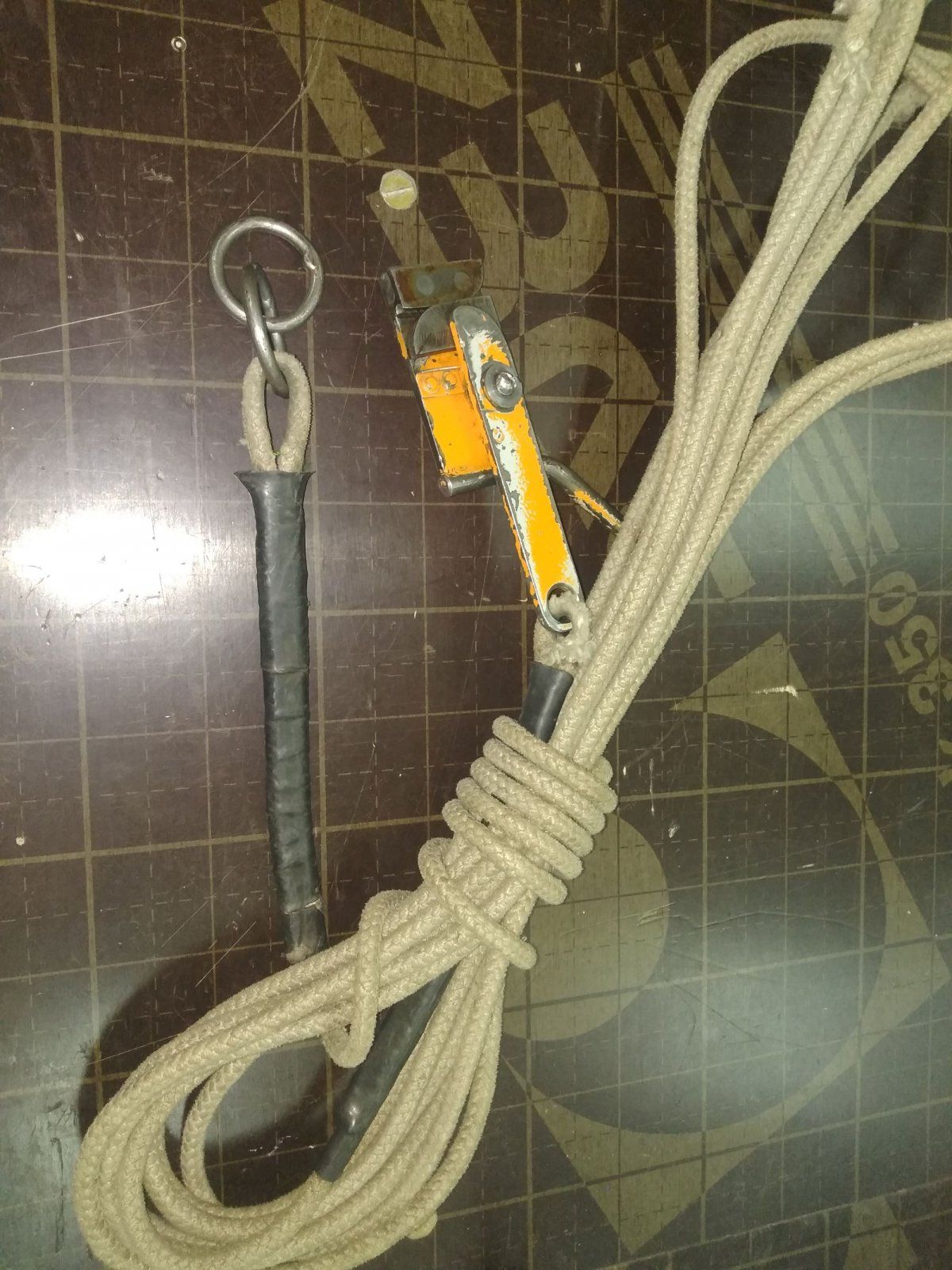 Чёрная темоусадочная трубка для электромонтажных работ с клеевым слоем, диаметр 18 мм. закрывает место сшивки фала, шьём капроновыми нитками, длинна нахлёста 18 см. Длинна фала 12-15 метров, диаметр верёвки 10 мм.